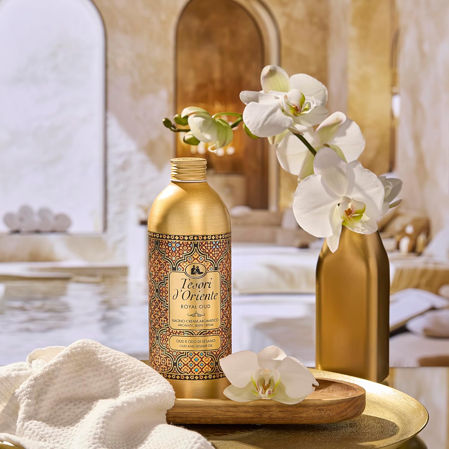 Tesori d’Oriente Royal Oud to wysublimowany, kremowy płyn do kąpieli inspirowany bogactwem arabskich pałaców, pełnych złota, kadzideł i szlachetnych aromatów drzewnych. Gęsta, aksamitna piana otula ciało intensywnym, orientalnym zapachem, a wyjątkowe nuty oud tworzą atmosferę luksusu i tajemnicy, przywodząc na myśl mistyczne opowieści z Bliskiego Wschodu.
